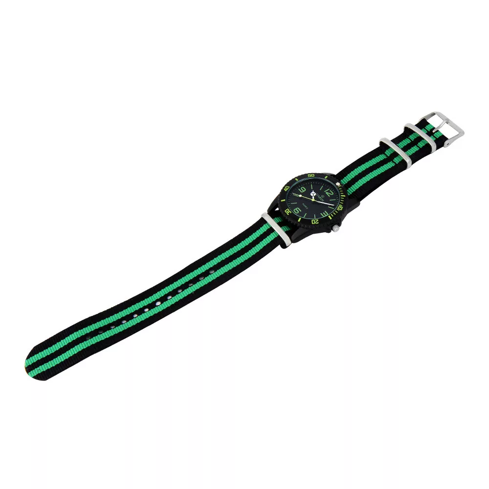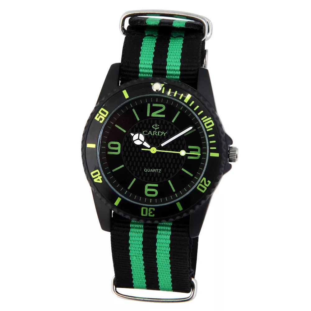 Cardy férfi karóra, fekete színű fém tok, fekete/zöld színű textilszövet szíj, fekete színű számlap, quartz szerkezet, cseppmentes vízállóság
