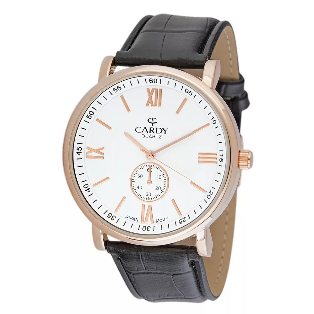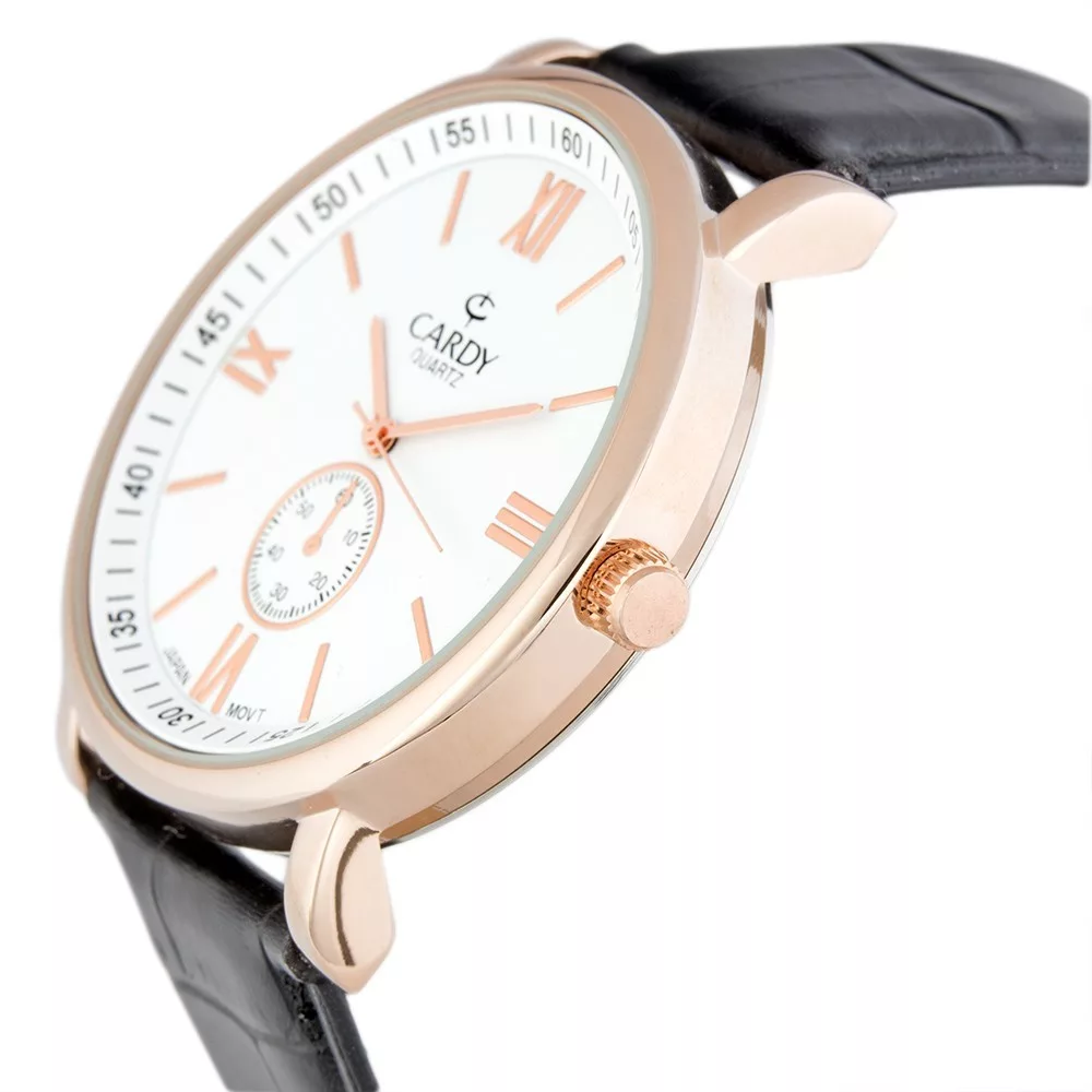 Cardy férfi karóra, rózsaarany színű fémtok, fekete színű szíj, fehér színű számlap, quartz szerkezet, cseppmentes vízállóság