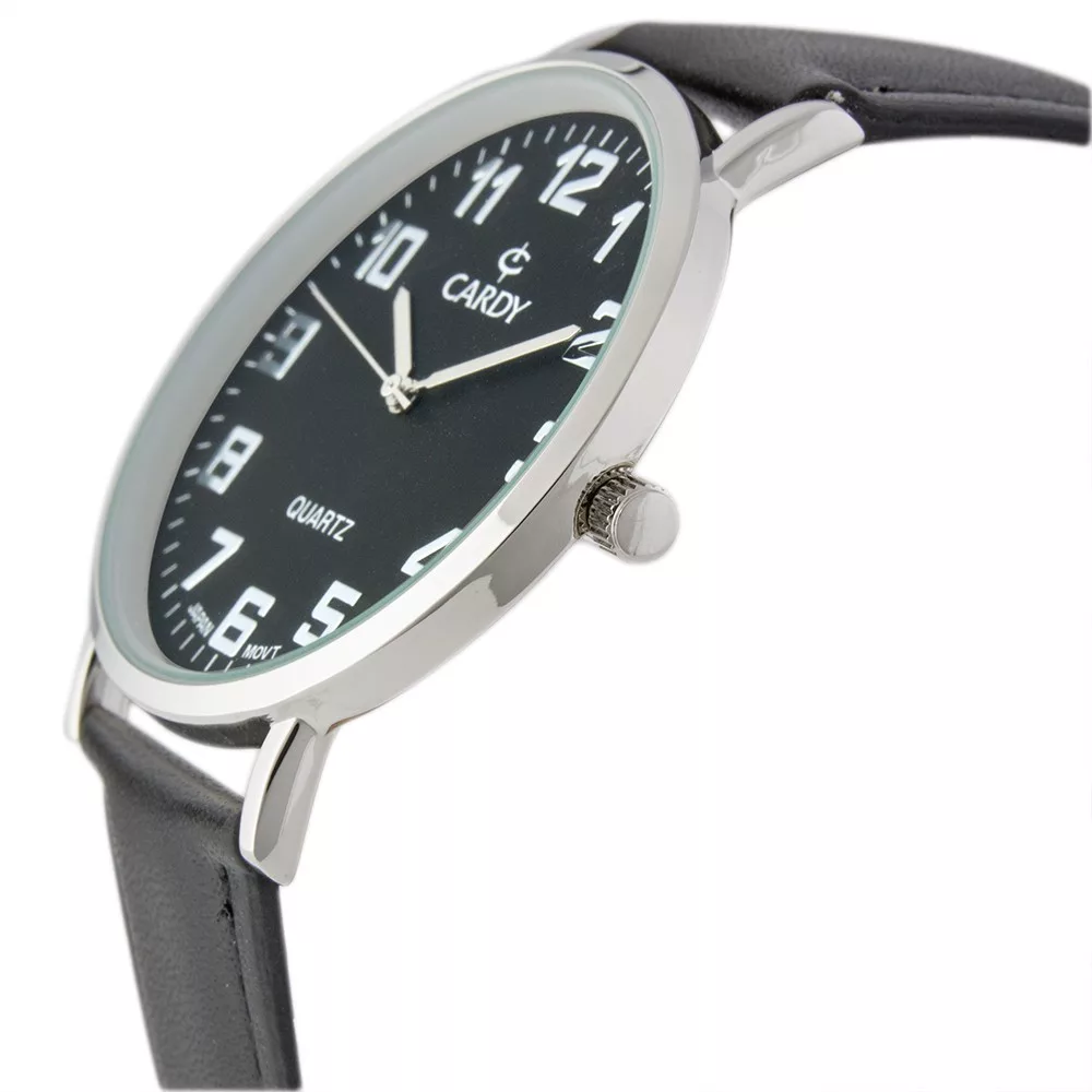 Cardy férfi karóra, ezüst színű fémtok, fekete színű szíj, fekete számlap, quartz szerkezet, cseppmentes vízállóság