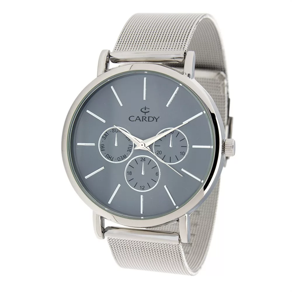 Cardy férfi karóra, ezüst színű fémtok, ezüst színű acél karcsat (mesh band), szürke számlap, quartz szerkezet, cseppmentes vízállóság