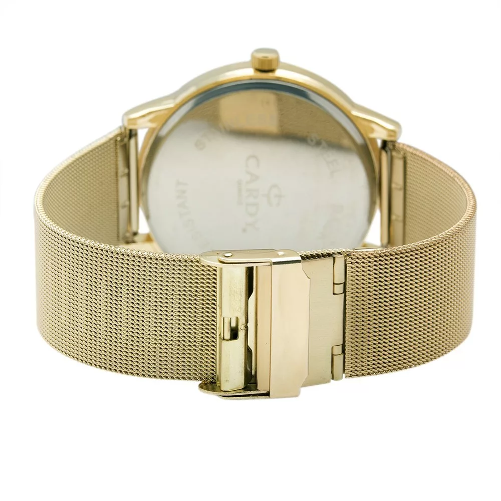 Cardy férfi karóra, arany színű fémtok, arany színű acél karcsat (mesh band), ezüst színű számlap, quartz szerkezet, cseppmentes vízállóság
