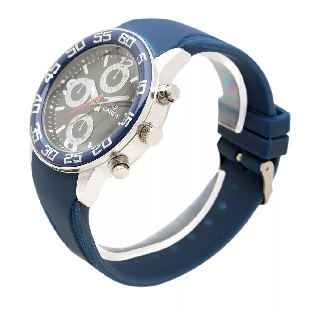 Cardy férfi karóra, ezüst színű fémtok, kék színű műanyag szíj, fekete számlap, quartz szerkezet, cseppmentes vízállóság