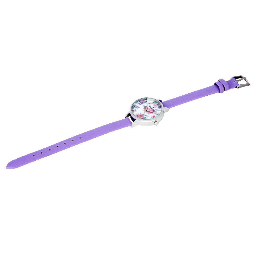 Cardy női karóra, ezüst színű fémtok, lila színű szíj, virágos mintás számlap, quartz szerkezet, cseppmentes vízállóság