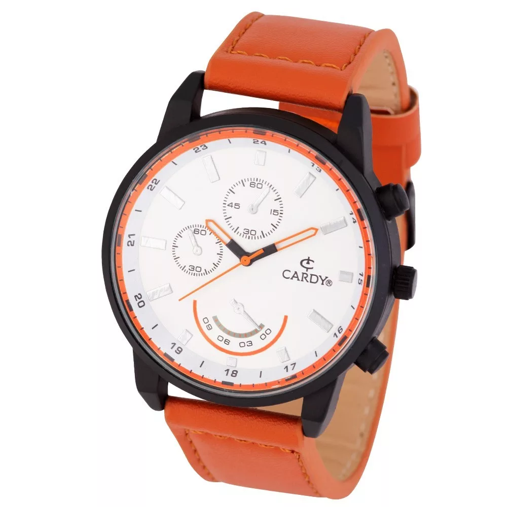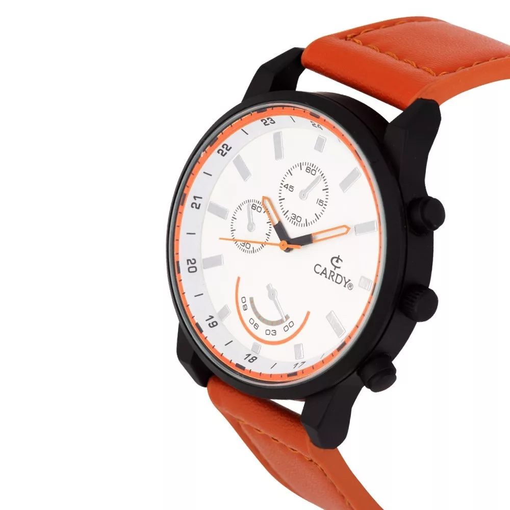 Cardy férfi karóra, fekete színű fémtok, barna színű szíj, fehér számlap, quartz szerkezet, cseppmentes vízállóság