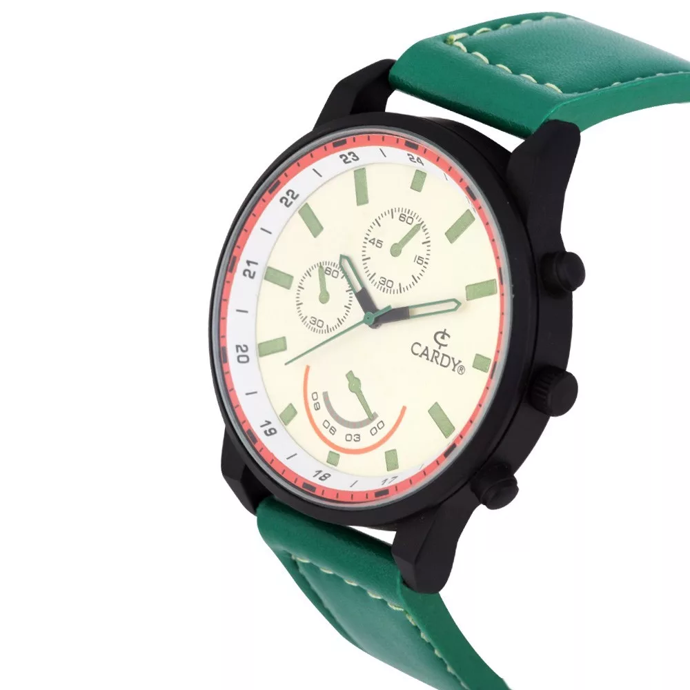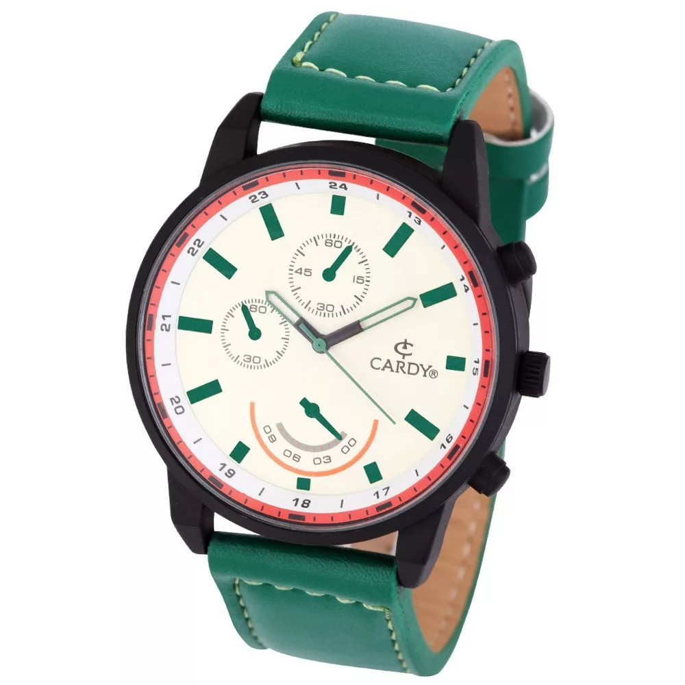Cardy férfi karóra, fekete színű fémtok, zöld színű szíj, fehér színű számlap, quartz szerkezet, cseppmentes vízállóság