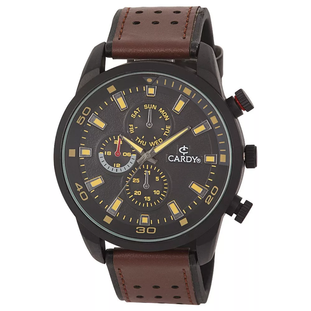 Cardy férfi karóra, fekete színű fémtok, barna / fekete szíj, fekete számlap, quartz szerkezet, cseppmentes vízállóság