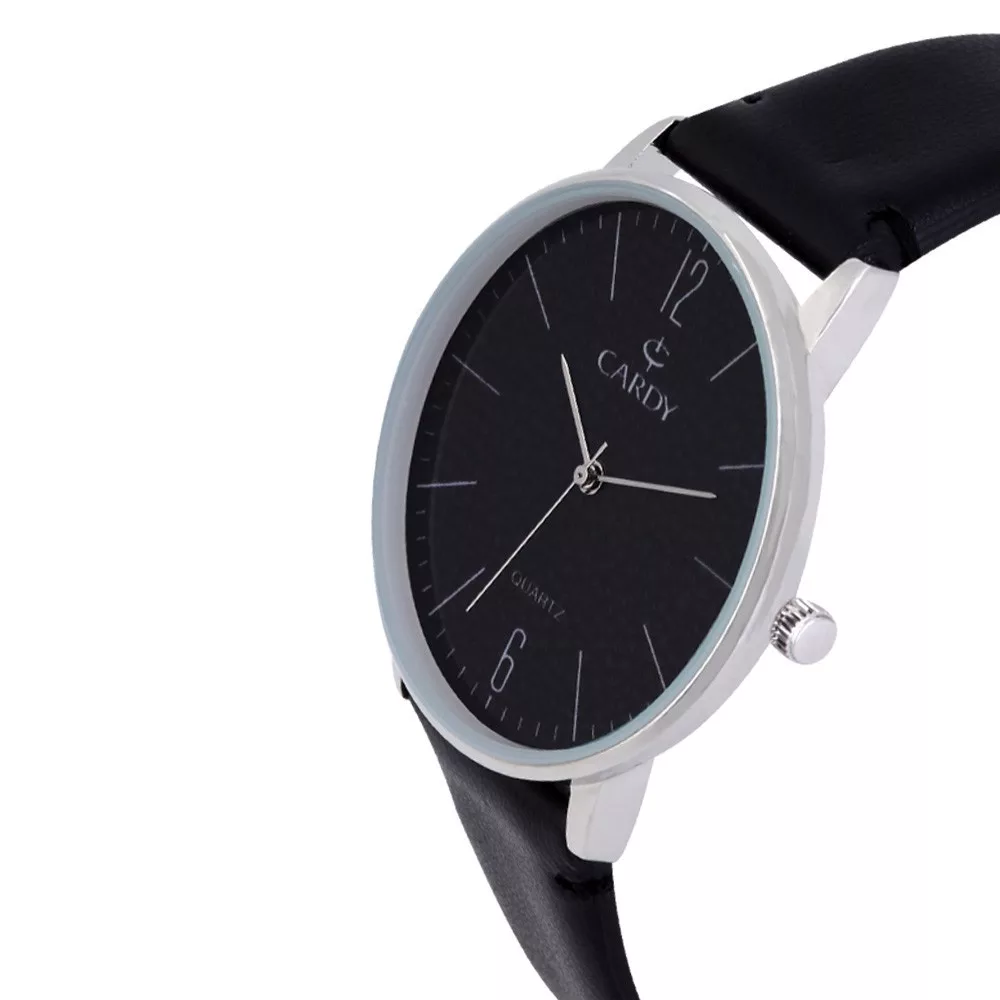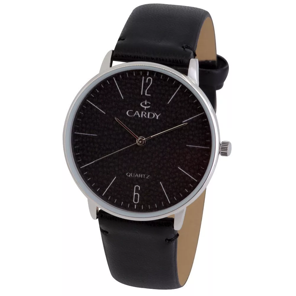 Cardy férfi karóra, ezüst színű fémtok, fekete szíj, fekete számlap, quartz szerkezet, cseppmentes vízállóság