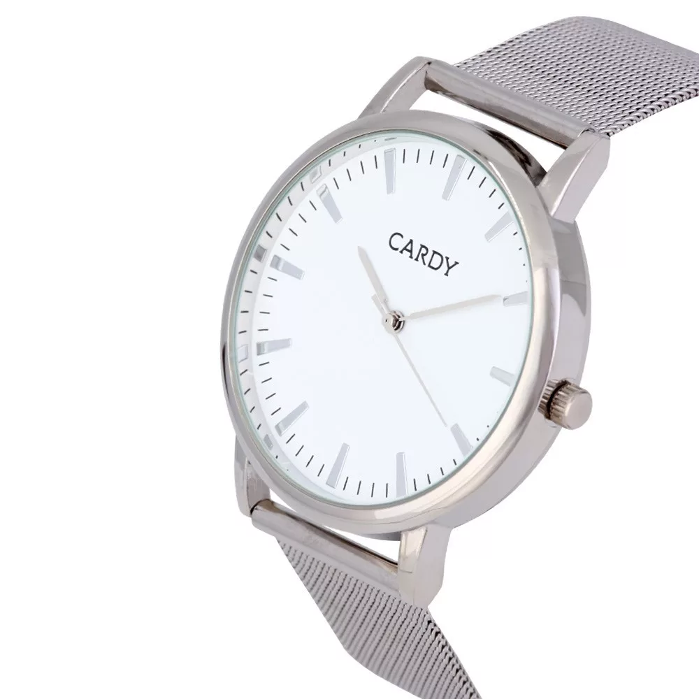 Cardy férfi karóra, ezüst színű fémtok, ezüst színű acél karcsat (mesh band), fehér számlap, quartz szerkezet, cseppmentes vízállóság
