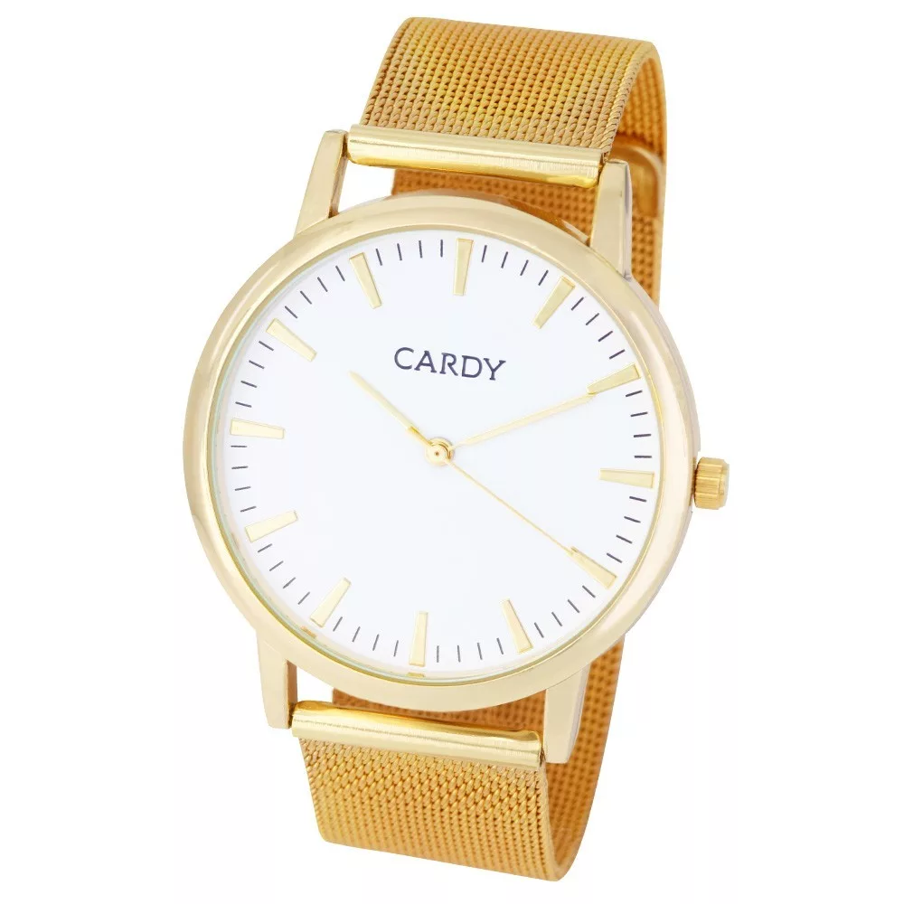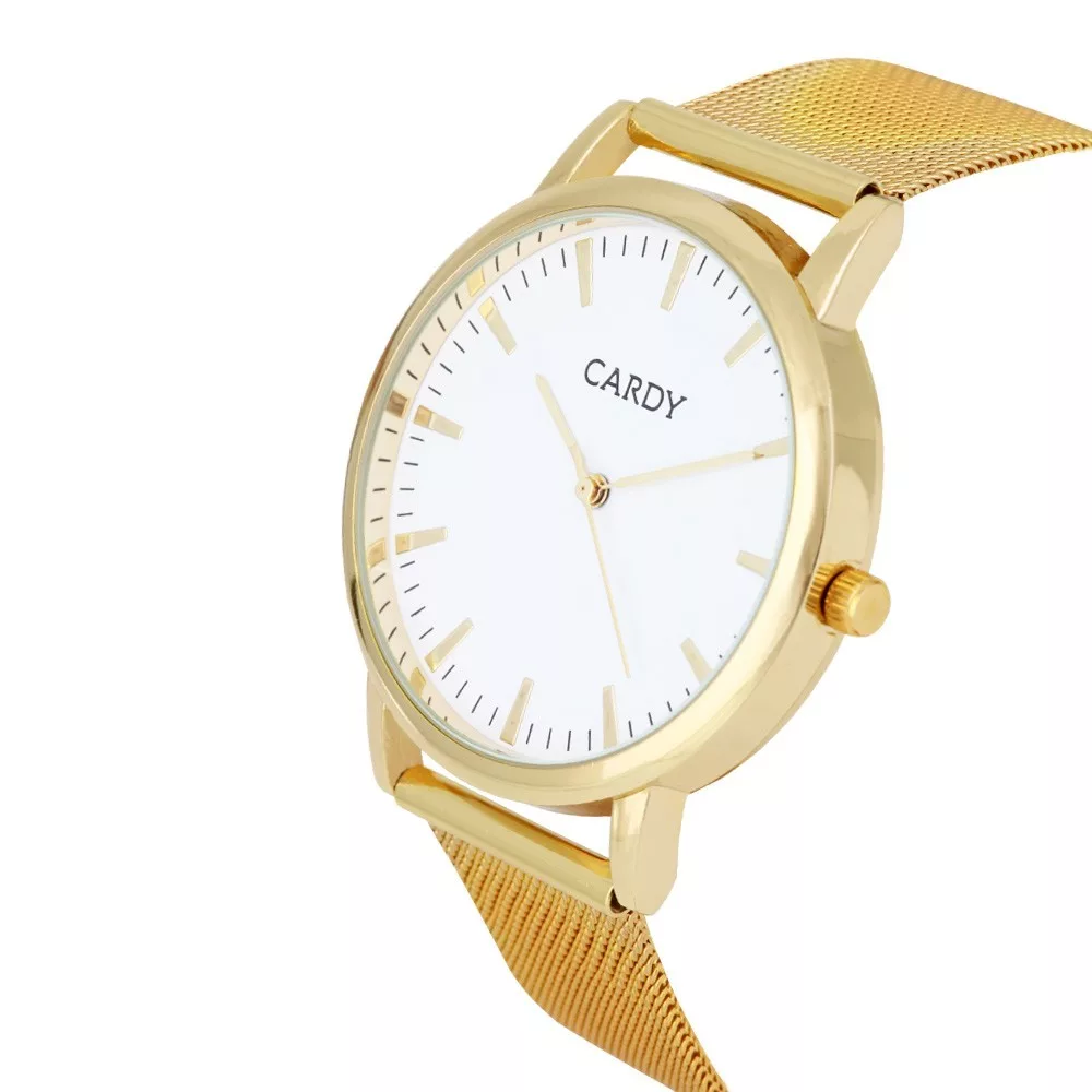 Cardy férfi karóra, arany színű fémtok, arany színű acél csat (mesh band), fehér számlap, quartz szerkezet, cseppmentes vízállóság