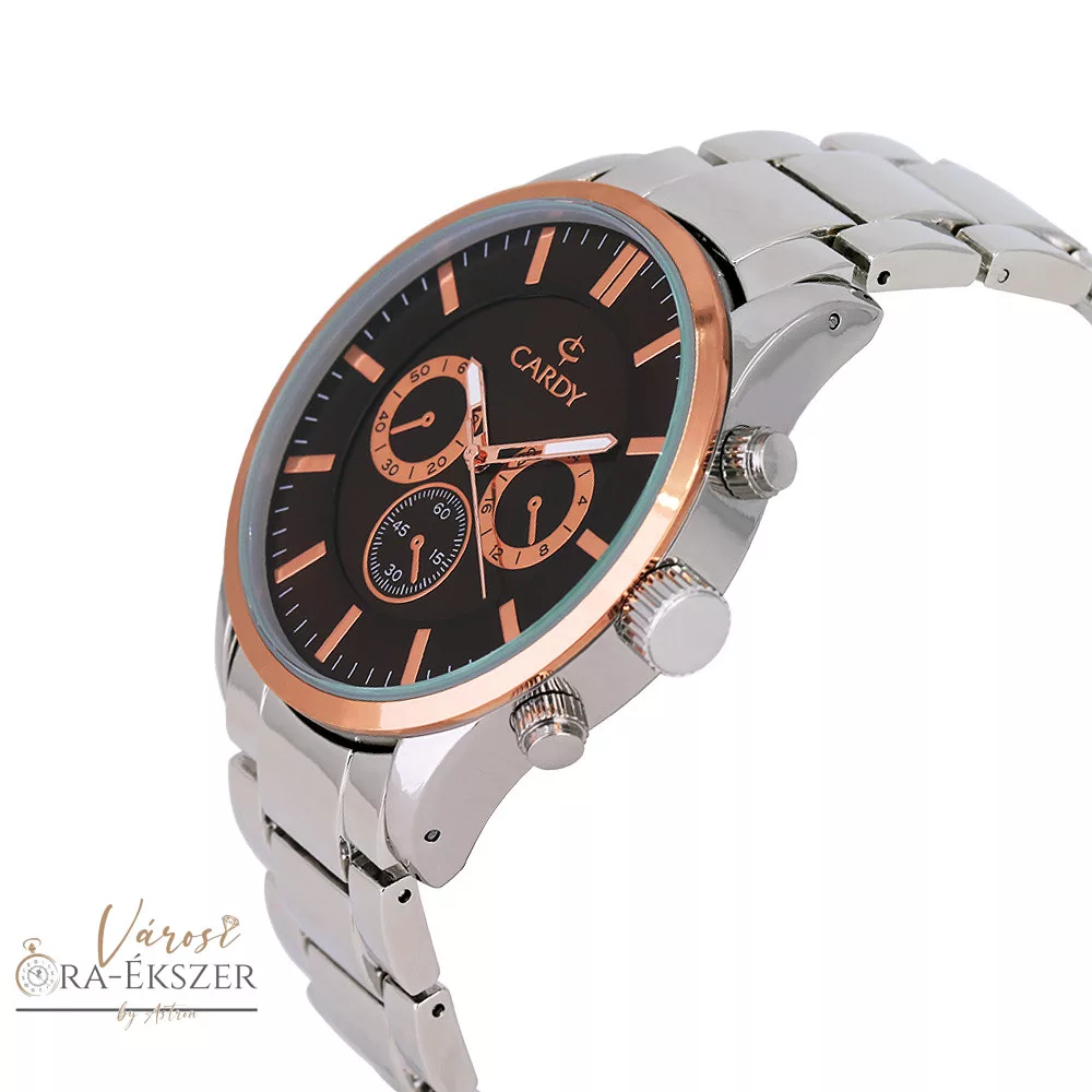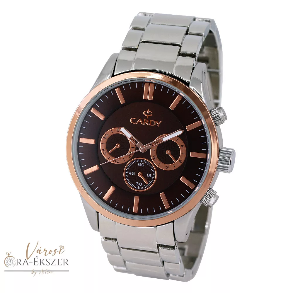 Cardy férfi karóra, quartz, bicolor színű fémtok, ezüst színű fém karcsat, barna színű számlap, cseppmentes vízállóság