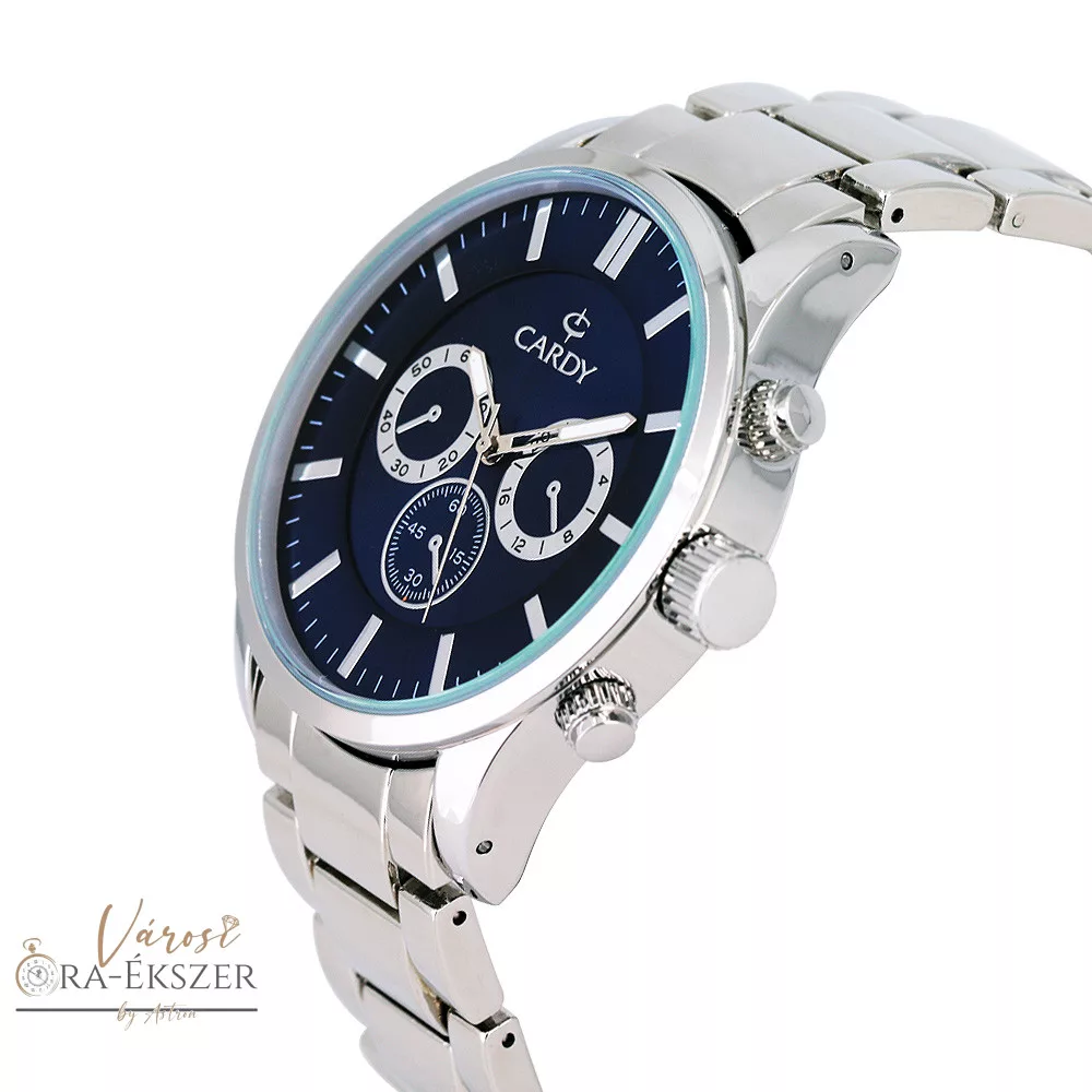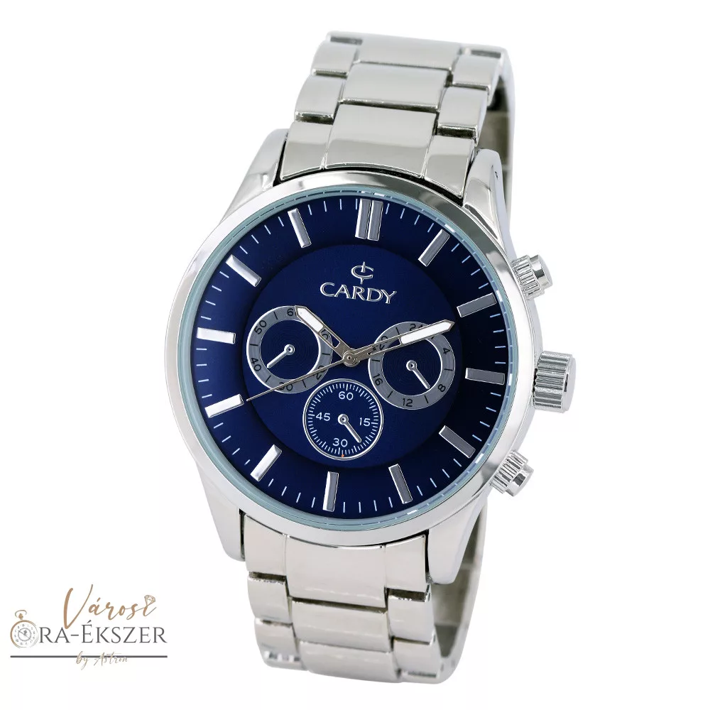 Cardy férfi karóra, quartz, ezüst színű fémtok, ezüst színű fém karcsat, kék színű számlap, cseppmentes vízállóság