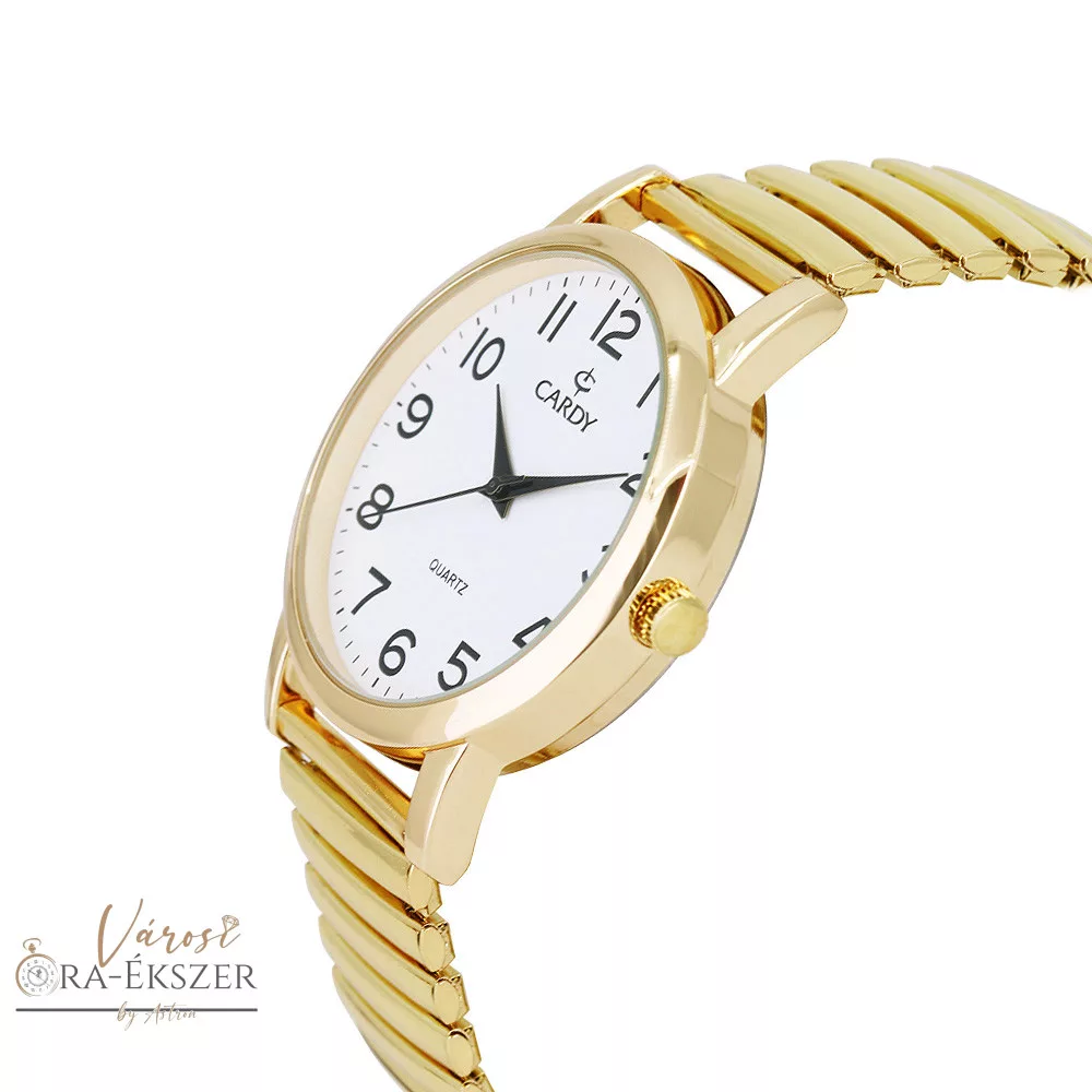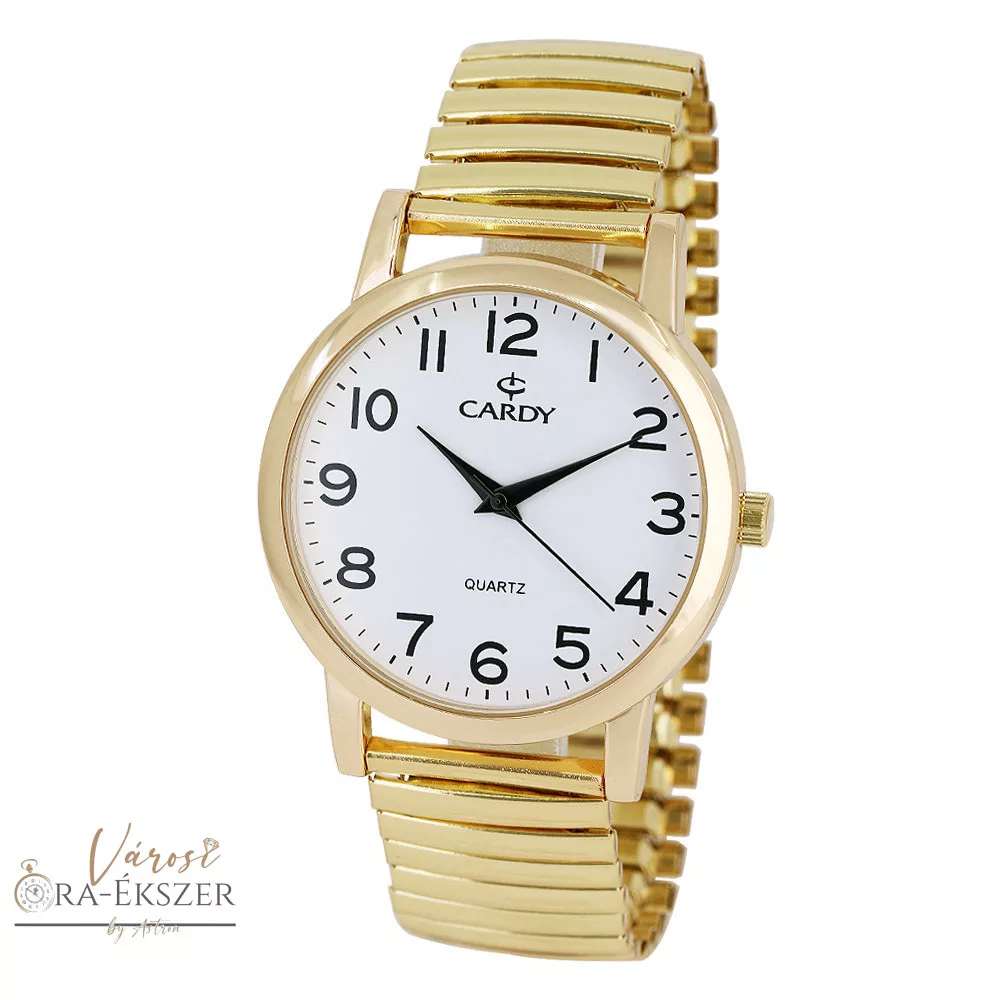 Cardy férfi karóra, arany színű fémtok, arany színű acél rugóscsat, fehér színű arab számos számlap, quartz szerkezet, cseppmentes vízállóság