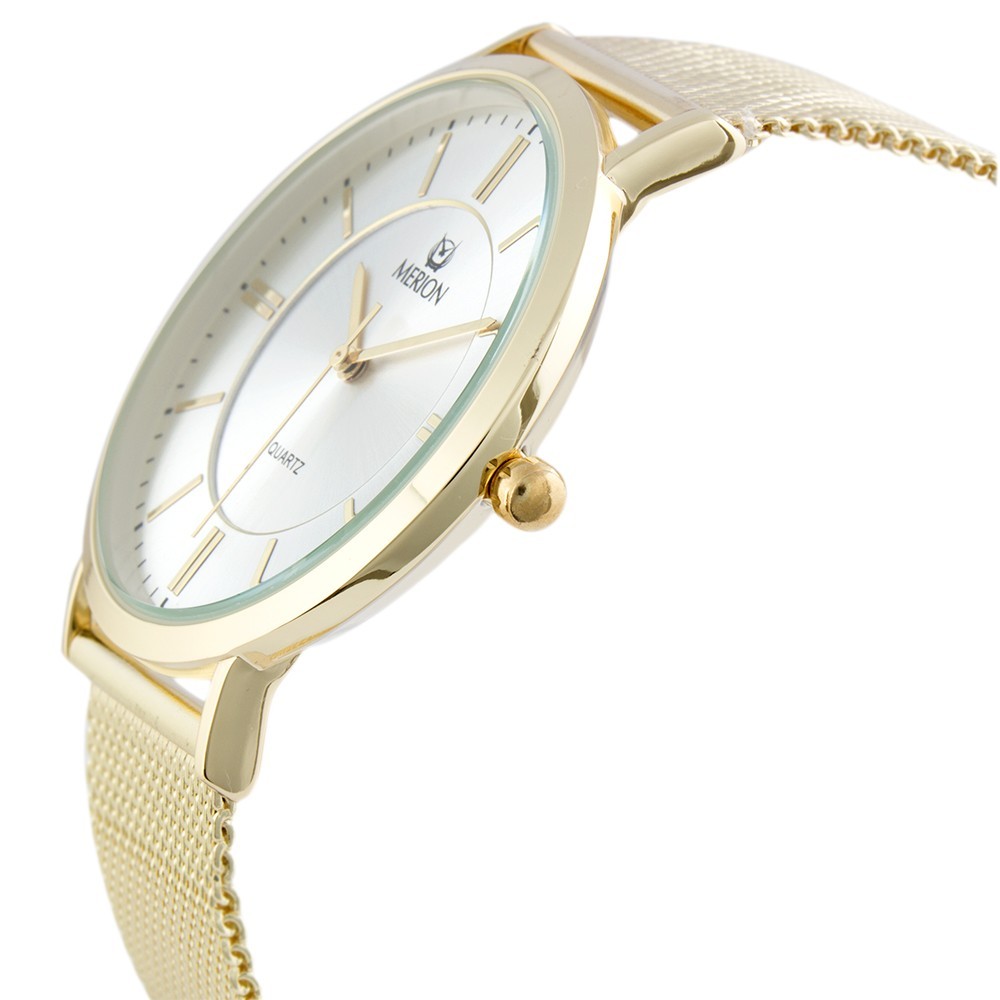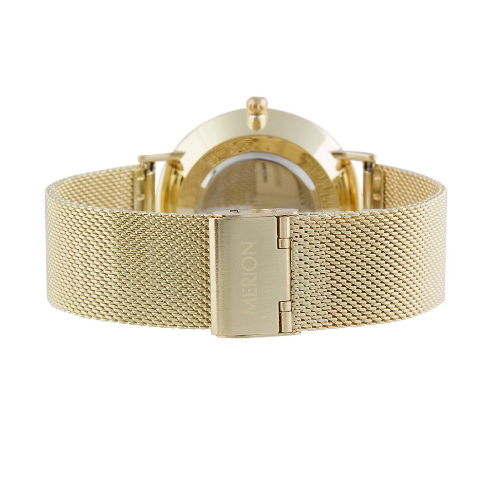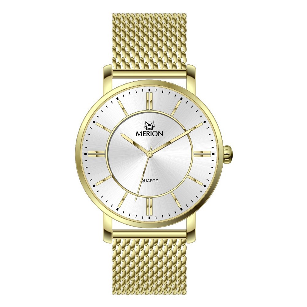 Merion férfi karóra, arany színű fém tok, arany színű nemesacél csat (mesh band), ezüst színű számlap, ásványüveg, quartz szerkezet, cseppmentesség