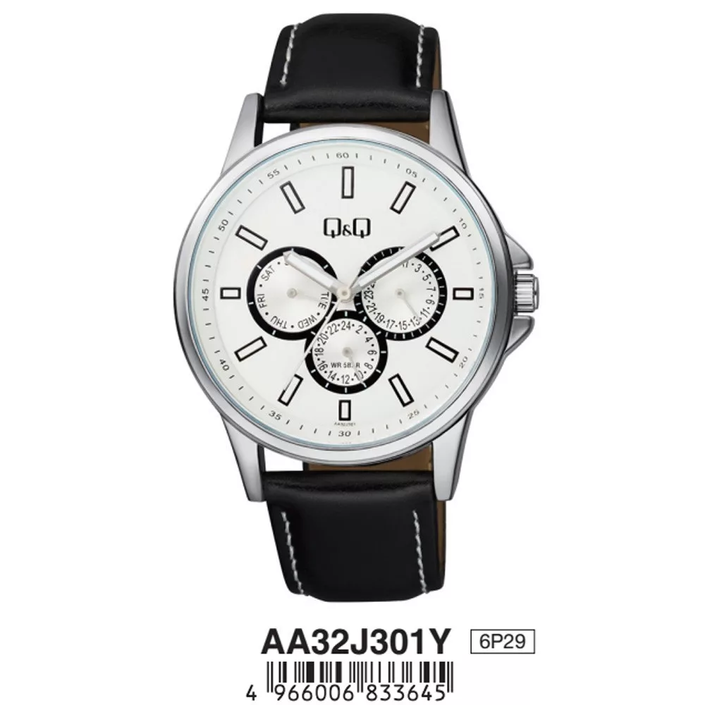 Q&Q férfi bőrszíjas karóra, ezüst színű tok, fekete színű szíj, fehér számlap, AA32J301Y