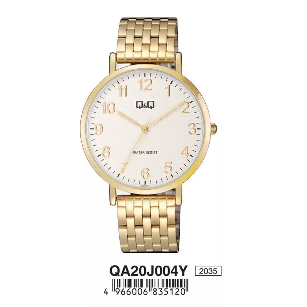 Q&Q férfi fémcsatos karóra, arany színű tok, arany színű szíj, fehér számlap, QA20J004Y