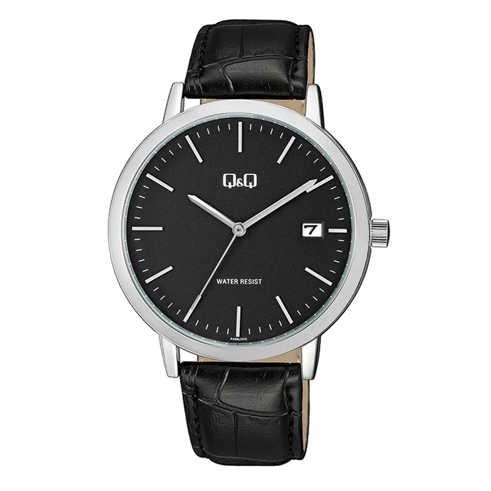 Q&Q férfi karóra, quartz, ezüst színű tok, fekete szíj és számlap, A486J302Y