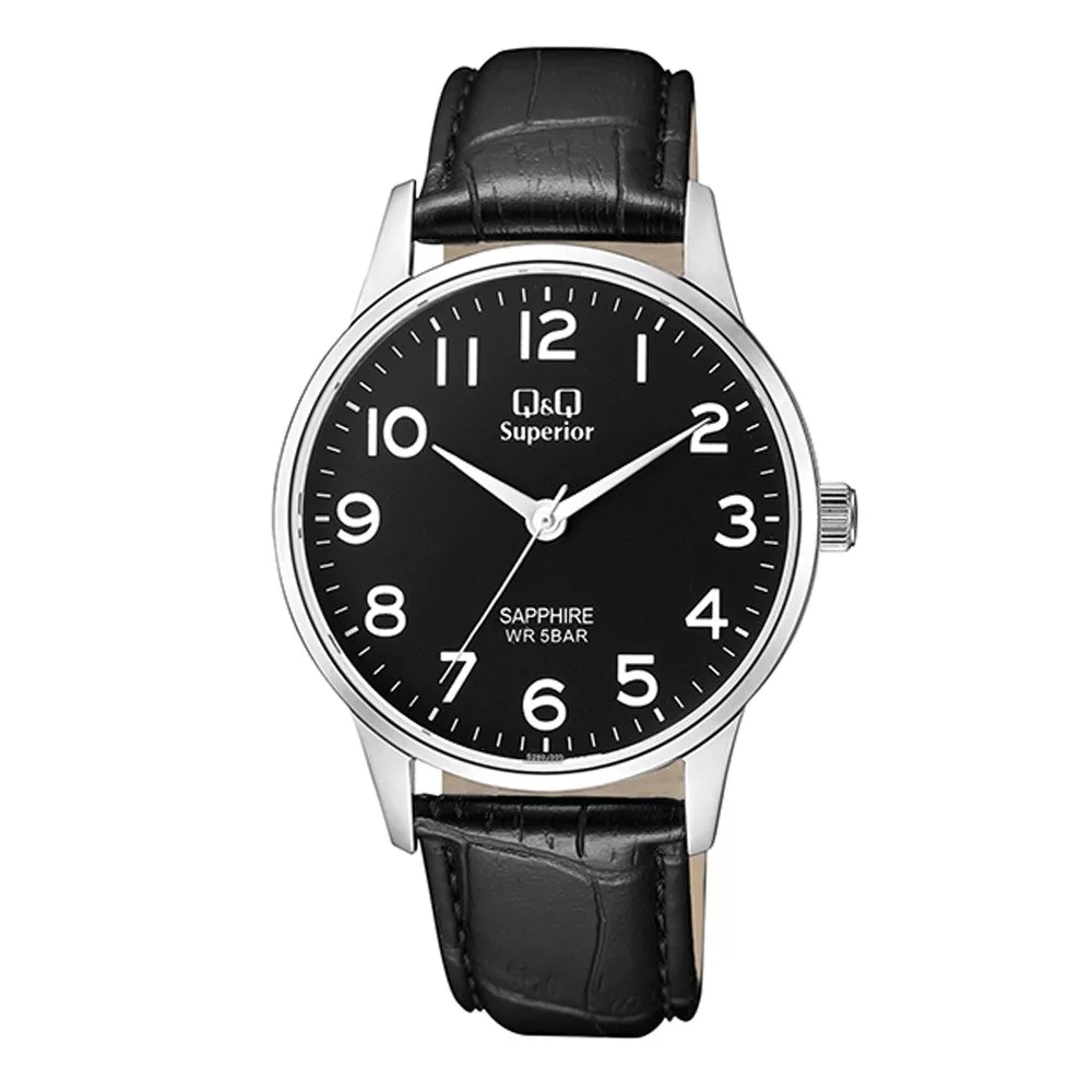 Q&Q férfi karóra, quartz, ezüst színű tok, fekete színű bőrszíj, fekete számlap, (Superior) S280J305Y
