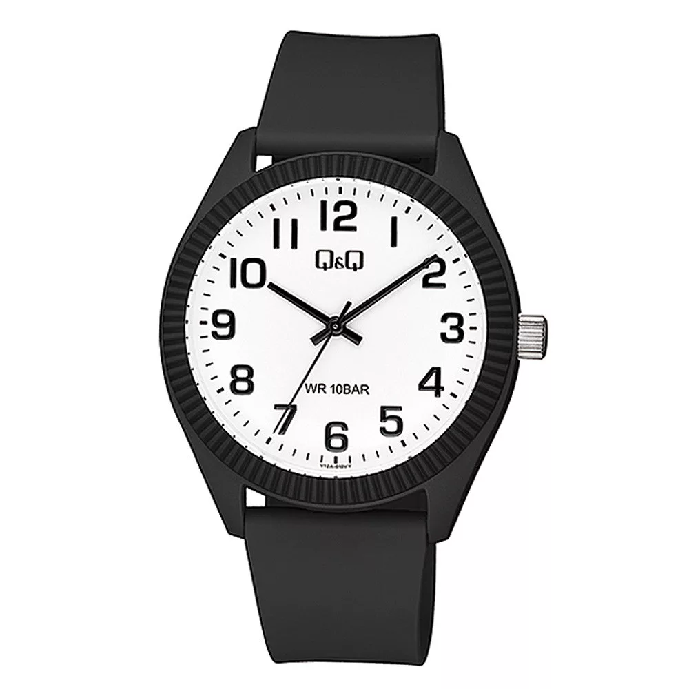 Q&Q férfi karóra, quartz, fekete színű műanyag tok, fekete színű műanyag szíj, fehér színű számlap,V12A-010VY