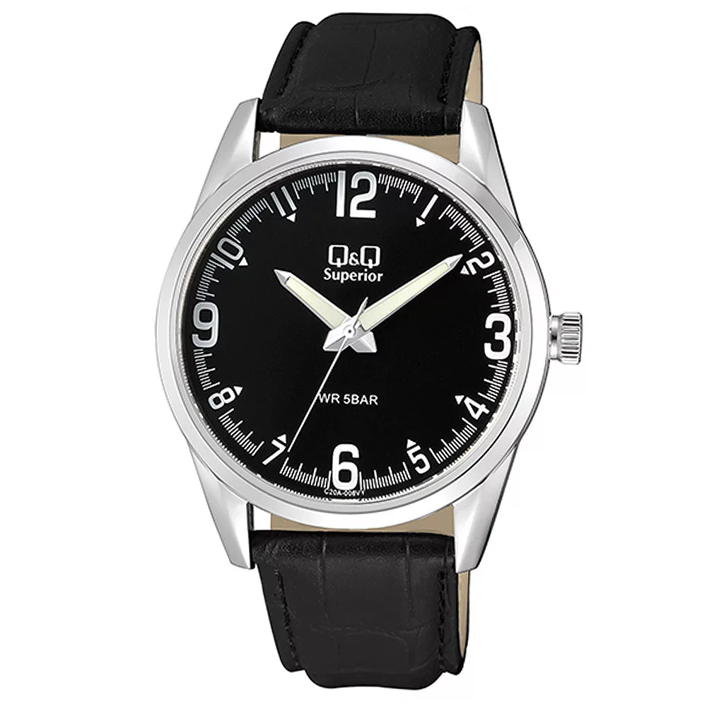 Q&Q férfi karóra, quartz, ezüst színű acél tok, fekete színű bőrszíj, fekete számlap, (Superior) C20A-008VY