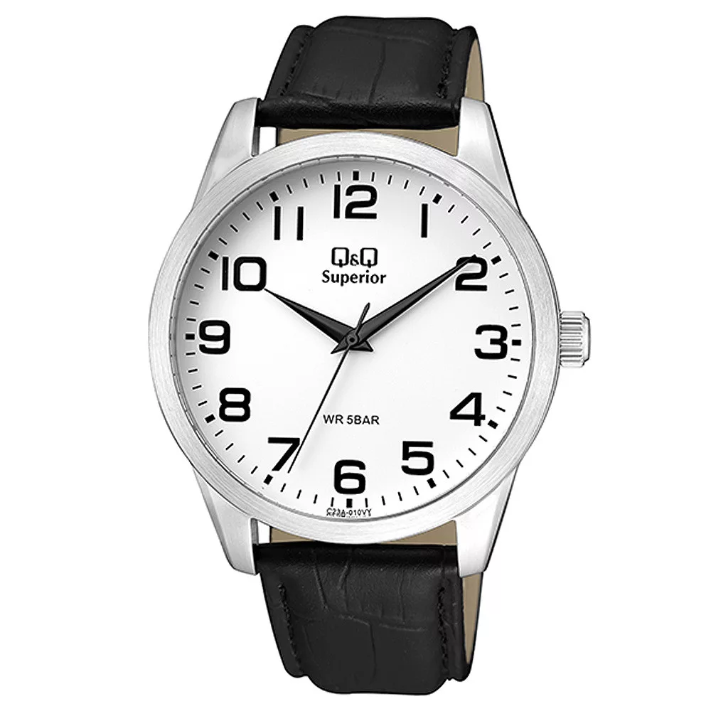 Q&Q férfi karóra, quartz, ezüst színű nemesacél tok, fekete színű bőrszíj, fehér számlap, (Superior) C23A-010VY