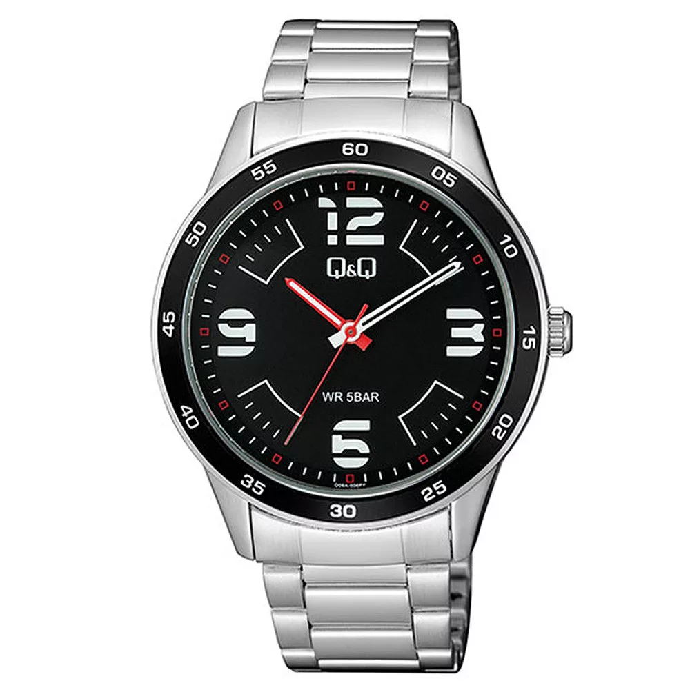 Q&Q férfi karóra, quartz, ezüst színű fémtok, ezüst színű acél karcsat, fekete számlap, Q09A-006PY