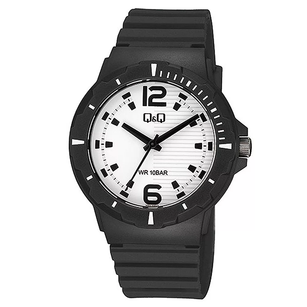 Q&Q férfi karóra, quartz, fekete színű műanyag tok, fekete színű műanyag szíj, fehér színű számlap, V02A-005VY
