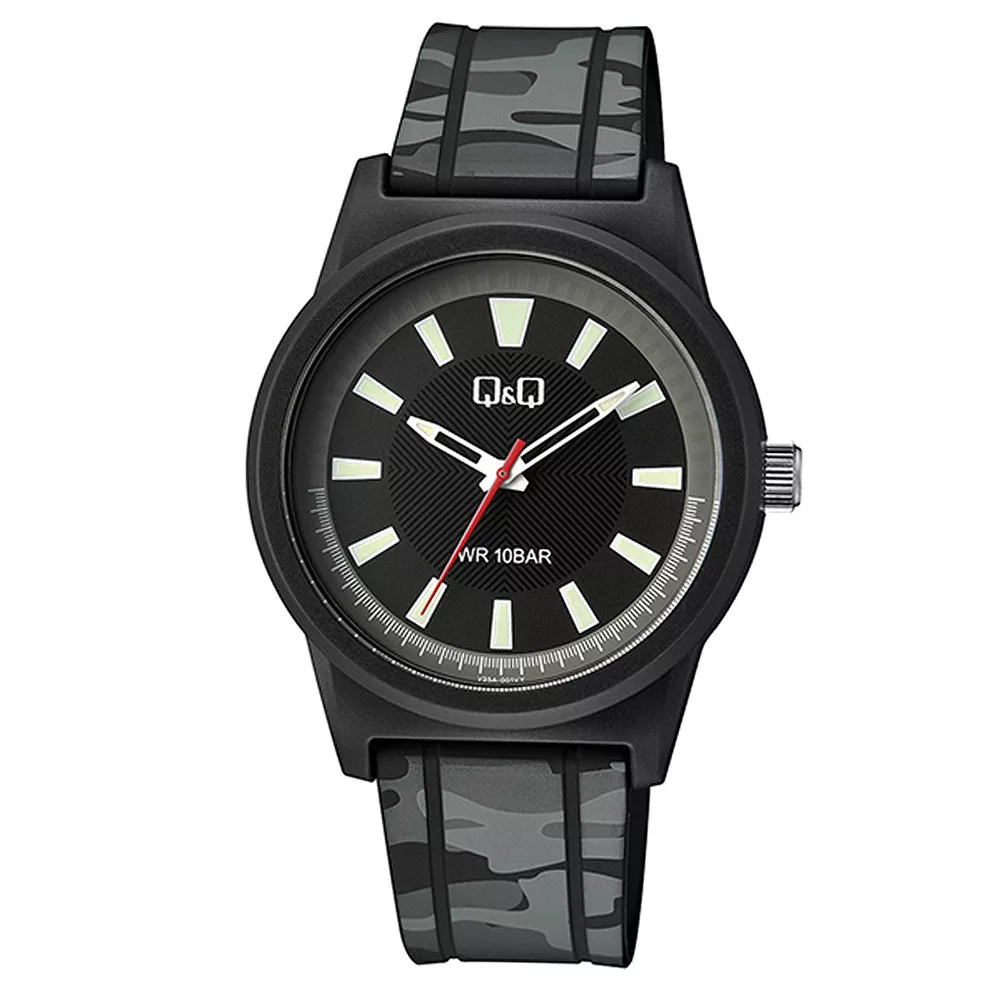 Q&Q férfi karóra, quartz, fekete színű műanyag tok, sötétszürke színű műanyag szíj, fekete számlap, V35A-001VY