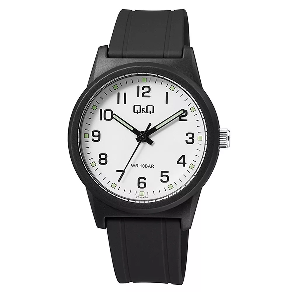 Q&Q férfi karóra, quartz, fekete színű műanyag tok, fekete színű műanyag szíj, fehér színű számlap, VR35J028Y