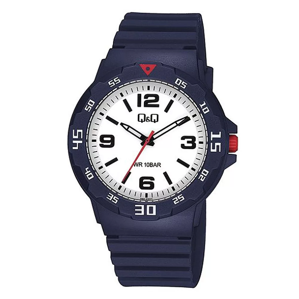 Q&Q férfi karóra, quartz, kék színű műanyag tok, fehér színű számlap, kék színű műanyag szíj, V02A-019VY