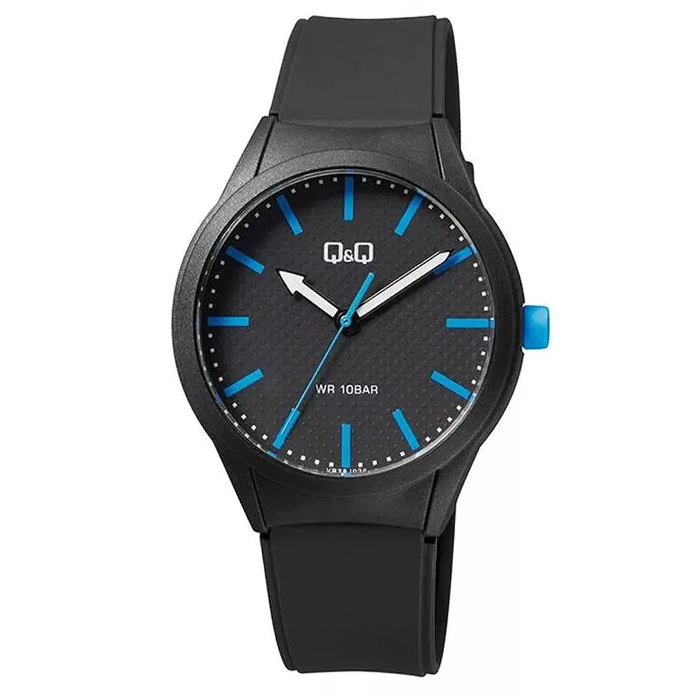 Q&Q férfi karóra, quartz, fekete színű műanyag tok, fekete színű számlap, fekete színű műanyag szíj, VR28J026Y