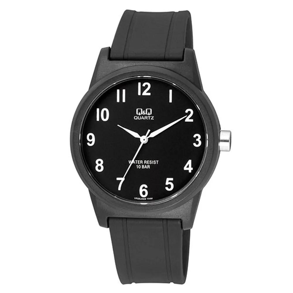 Q&Q férfi karóra, quartz, fekete színű műanyag tok, fekete színű számlap, fekete színű műanyag szíj, VR35J022Y