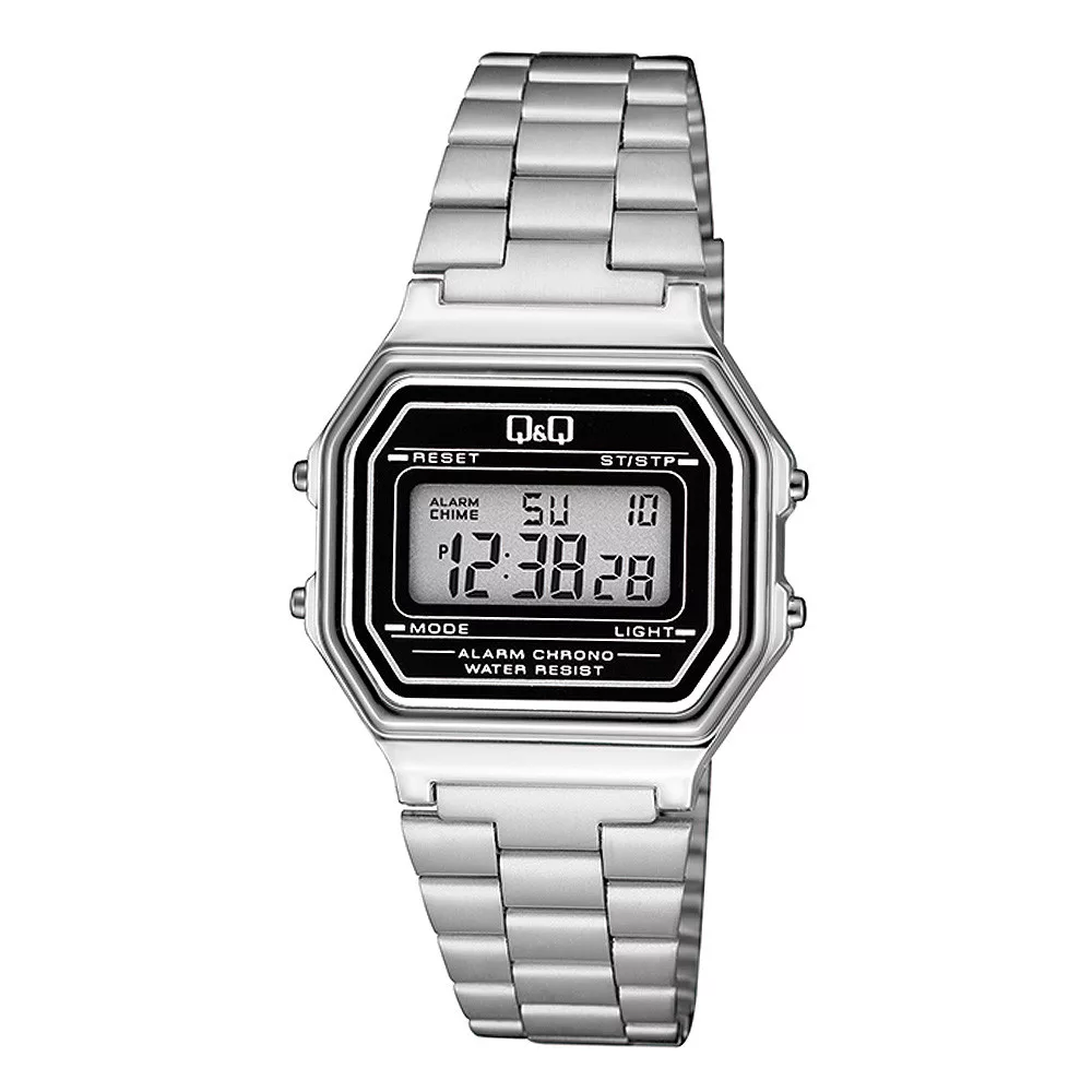 Q&Q férfi digitális karóra, quartz, ezüst színű fémtok, LCD kijelzés, ezüst színű acél karcsat, G17A-001JY