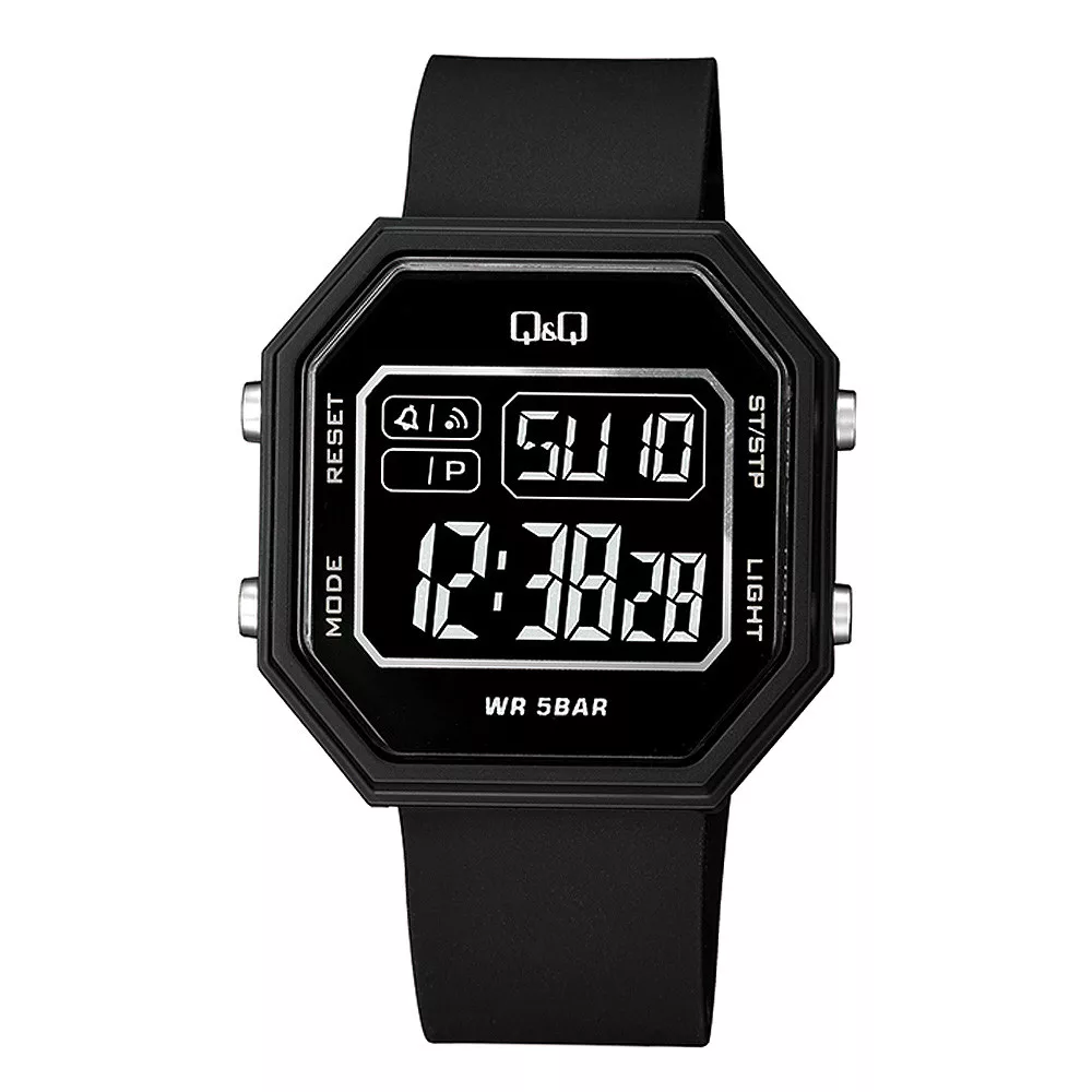 Q&Q férfi karóra, quartz, fekete színű műanyag tok, LCD kijelzés, fekete színű műanyag szíj, M206J002Y