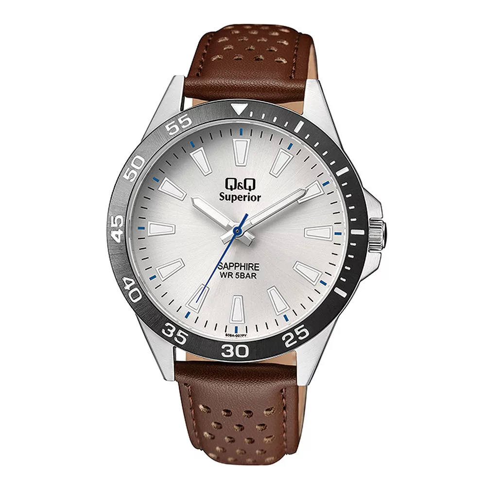 Q&Q férfi karóra, quartz, ezüst színű acél tok, ezüst színű számlap, barna színű bőrszíj, (Superior), zafír üveges, S08A-007PY
