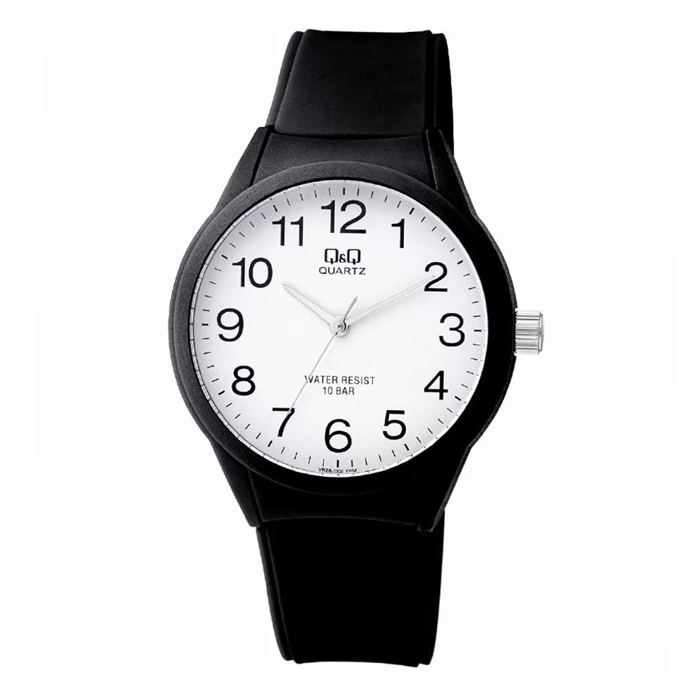 Q&Q férfi műanyag karóra, quartz, fekete színű műanyag tok, fekete színű műanyag szíj, fehér számlap, VR28J002Y