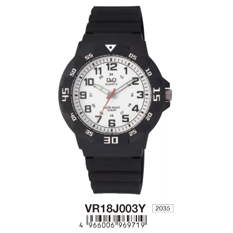 Q&Q analóg férfi sportos karóra, fekete színű műanyag tok, fekete műanyag szíj, arab számos fehér számlap, ásványüveg, quartz szerkezet, 100 m (10 ATM) vízállóság - VR18J003Y