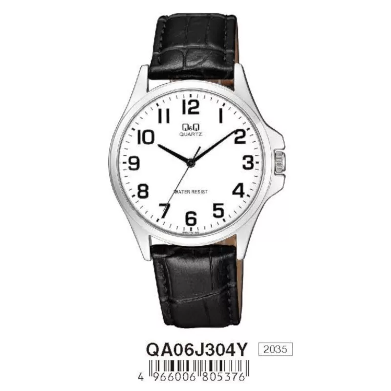 Q&Q analóg férfi klasszikus karóra, ezüst színű fém tok, fekete műbőr szíj, arab számos fehér számlap, ásványüveg, quartz szerkezet, cseppmentes vízállóság - QA06J304Y