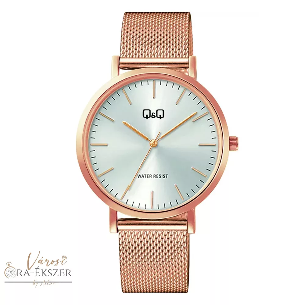 Q&Q unisex karóra, quartz, rózsaarany színű fémtok, rózsaarany színű nemesacél csat (mesh band), ezüst színű számlap, C34A-006PY