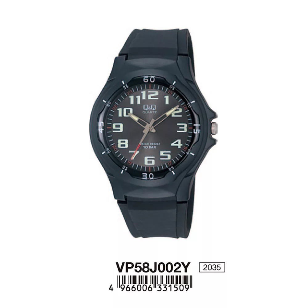 Q&Q analóg férfi sportos karóra, fekete színű műanyag tok, fekete műanyag szíj, arab számos fekete számlap, ásványüveg, quartz szerkezet, 100 m (10 ATM) vízállóság, műanyag hátlap, VP58J002Y
