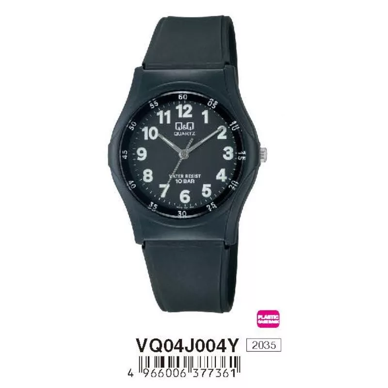 Q&Q analóg unisex karóra, fekete színű műanyag tok, fekete műanyag szíj, fekete számlap, ásványüveg, quartz szerkezet, 100 m (10 ATM) vízállóság, műanyag hátlap, VQ04J004Y