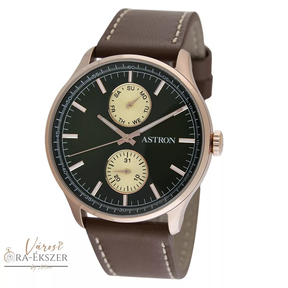 ASTRON 5502-4 férfi karóra, rózsaarany színű nemesacél tok, barna bőrszíj, zöld számlap, keményített ásványüveg, multifunkciós quartz szerkezet, 50 m (5 ATM) vízállóság