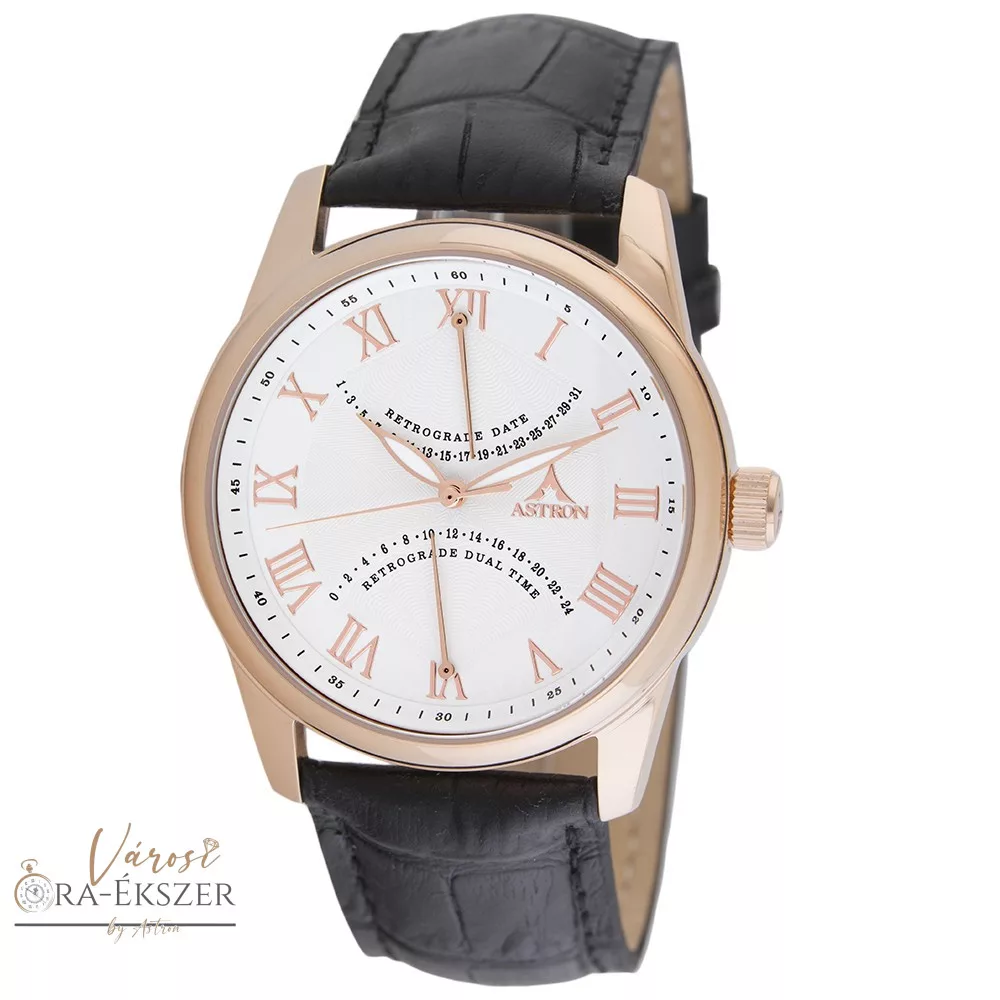 ASTRON 5507-8 férfi karóra, multifunkciós, rózsaarany színű nemesacél tok, fekete bőrszíj, fehér számlap, keményített ásványüveg, quartz szerkezet, 50 m (5 ATM) vízállóság