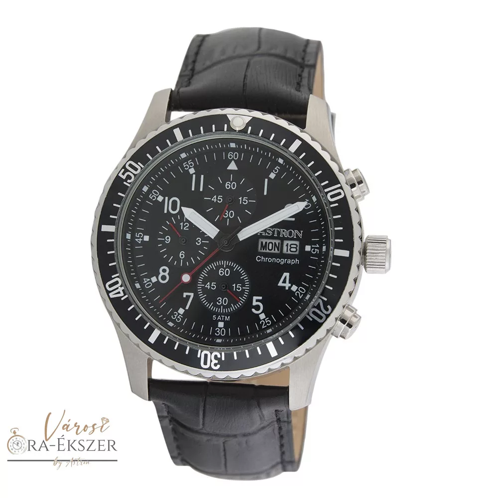 ASTRON 5508-0 férfi karóra, ezüst színű nemesacél tok, fekete bőrszíj, fekete számlap, keményített ásványüveg, chronograph quartz szerkezet, 50 m (5 ATM) vízállóság