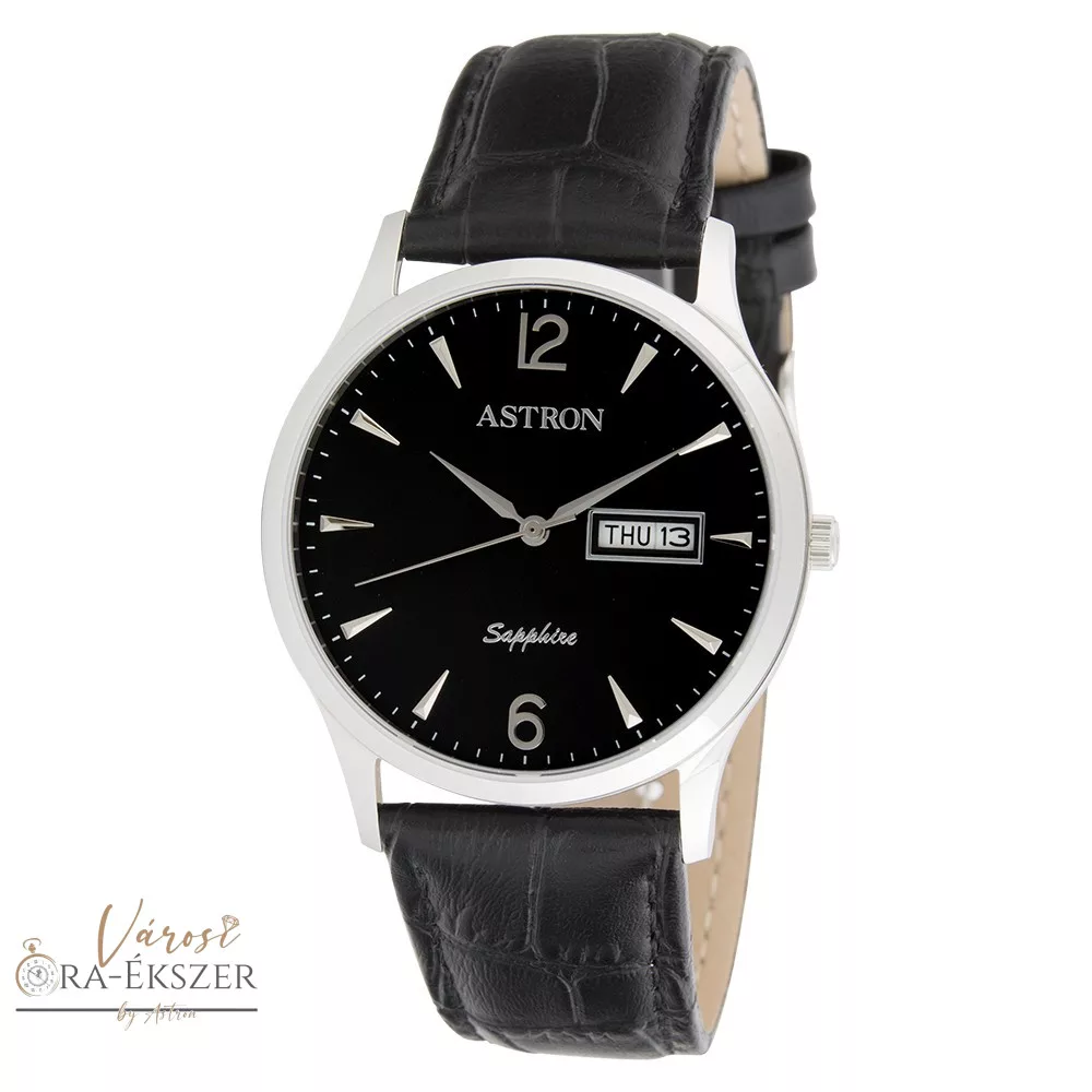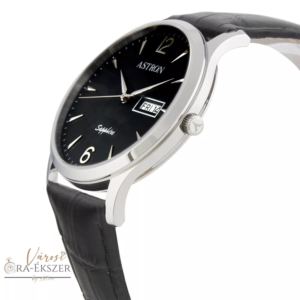 ASTRON 5511-1 férfi karóra, ezüst színű nemesacél tok, fekete bőrszíj, fekete számlap, zafír, quartz szerkezet, cseppmentes vízállóság