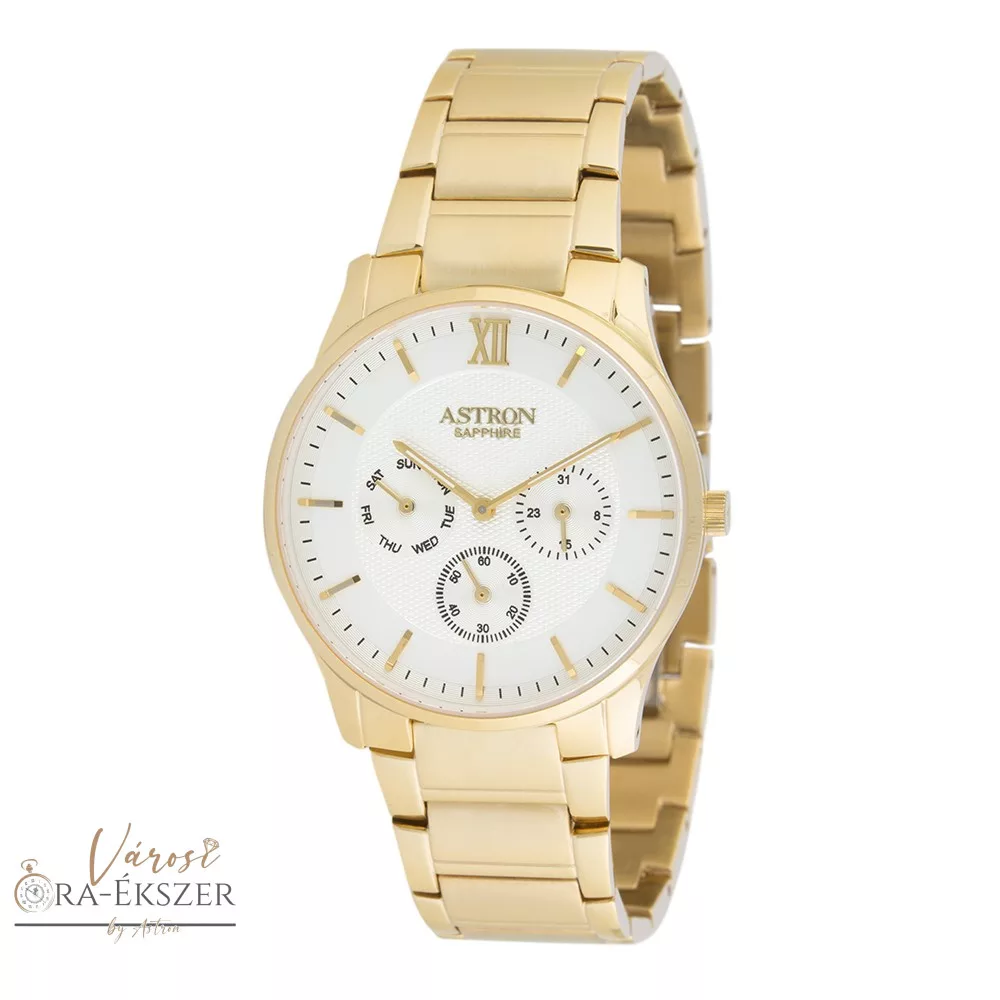 ASTRON 5512-8 elegáns férfi karóra, multifunkciós, arany színű nemesacél tok, arany színű nemesacél csat, fehér számlap, zafírüveg, multifunkciós quartz szerkezet, cseppmentes vízállóság