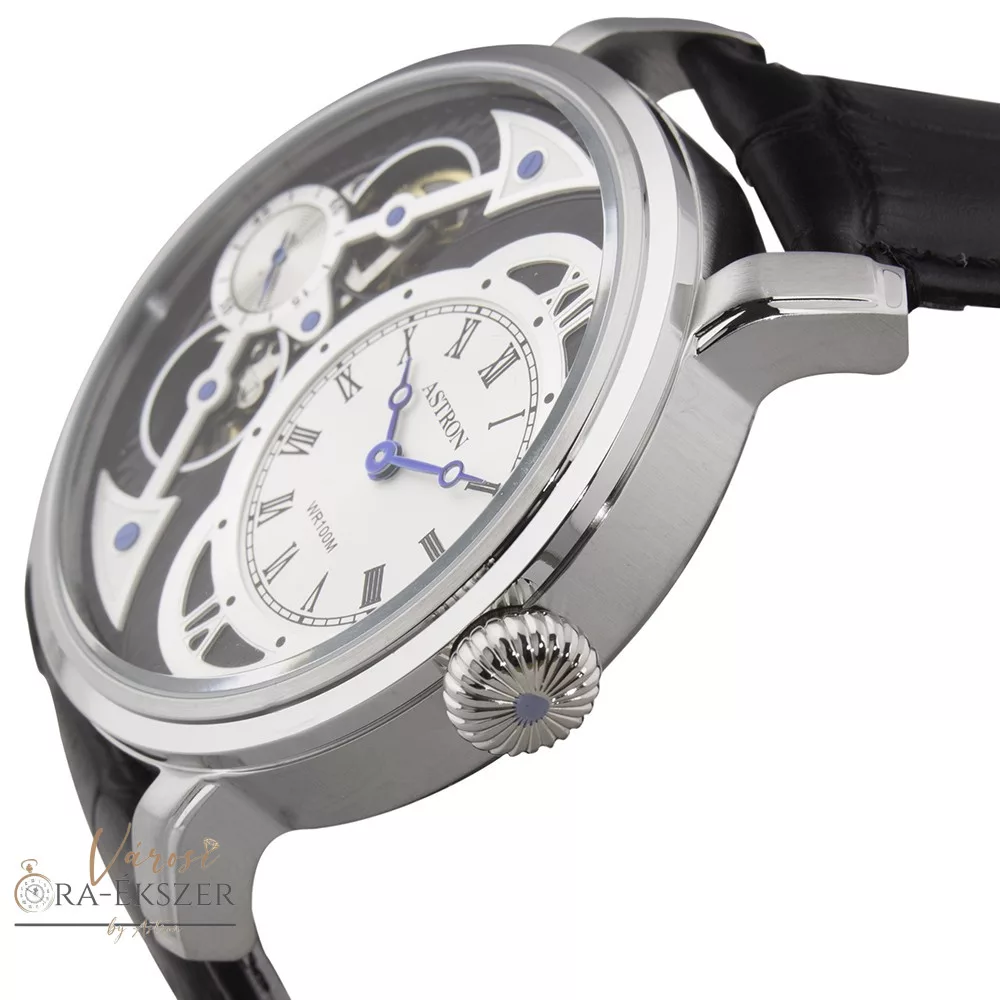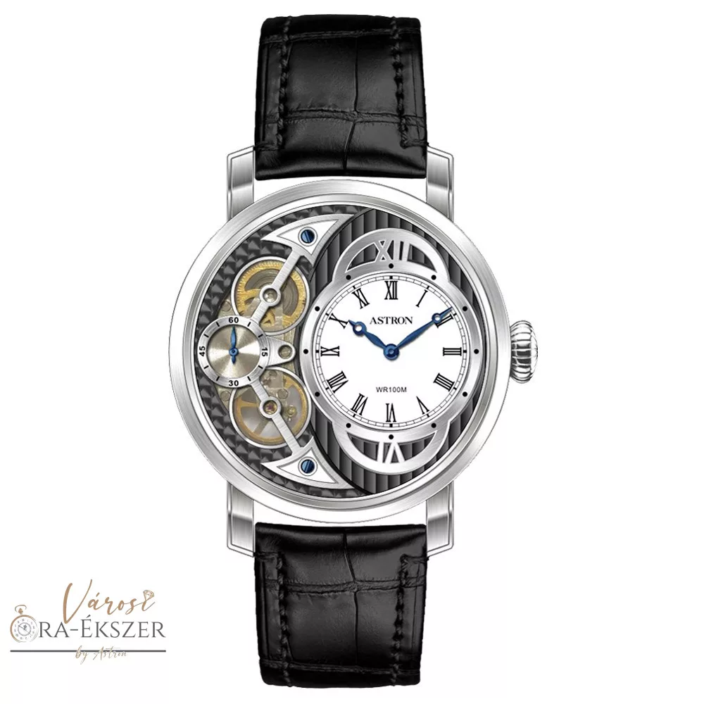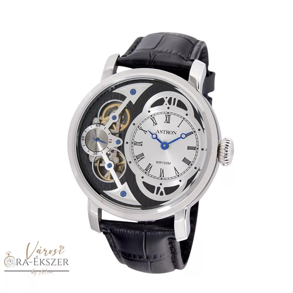 ASTRON 5522-6 férfi karóra, ezüst színű nemesacél tok, fekete bőrszíj, fekete számlap, keményített ásványüveg, (mechanikus+quartz) szerkezet, 100 m (10 ATM) vízállóság