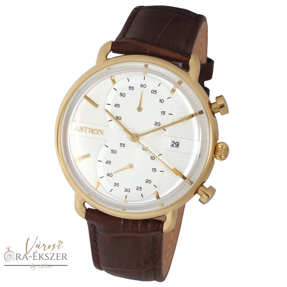 ASTRON 5532-9 férfi karóra, multifunkciós, arany színű nemesacél tok, barna bőrszíj, fehér számlap, keményített ásványüveg, quartz szerkezet, 50 m (5 ATM) vízállóság