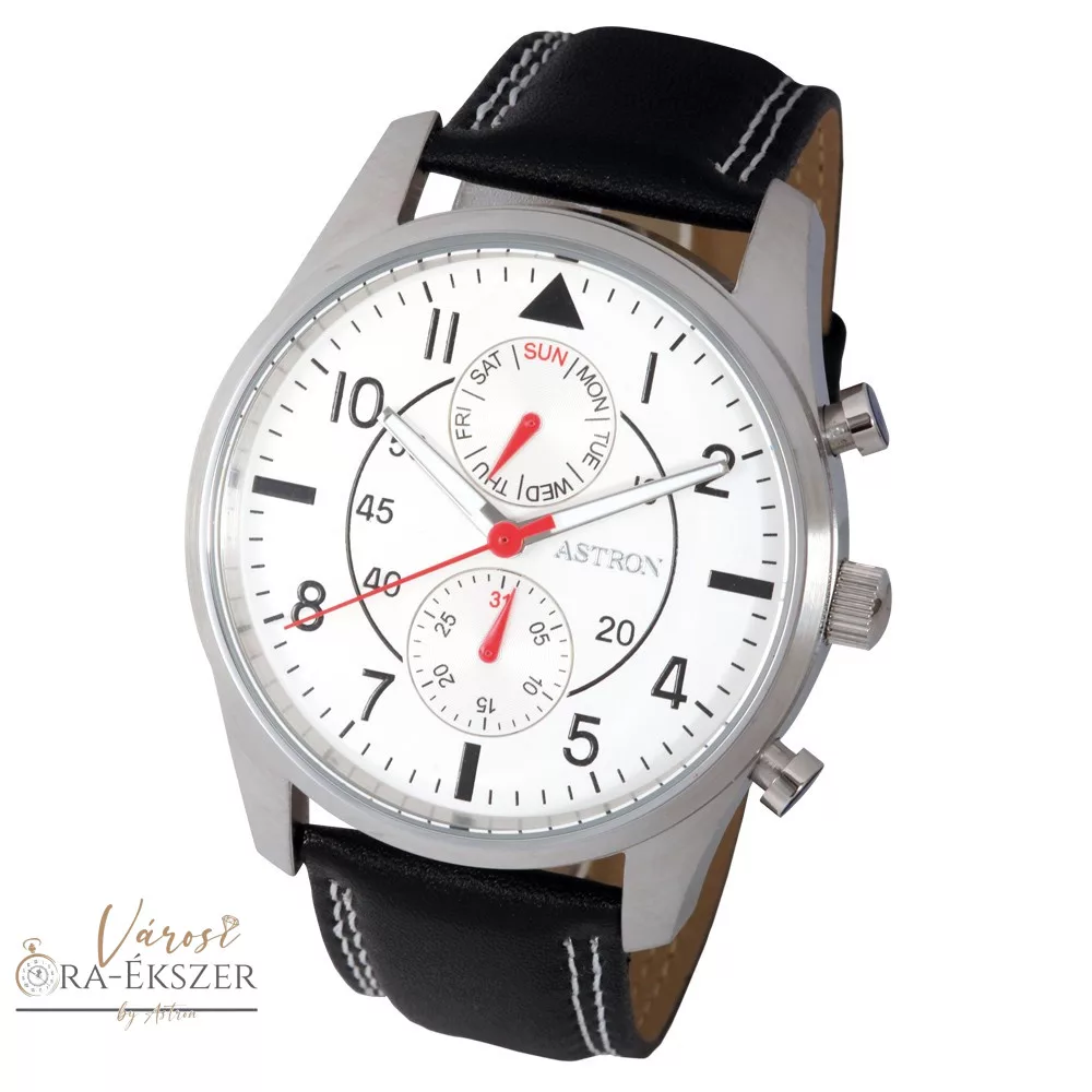 ASTRON 5534-7 férfi karóra, multifunkciós, ezüst színű nemesacél tok, fekete bőrszíj, fehér számlap, keményített ásványüveg, quartz szerkezet, 50 m (5 ATM) vízállóság