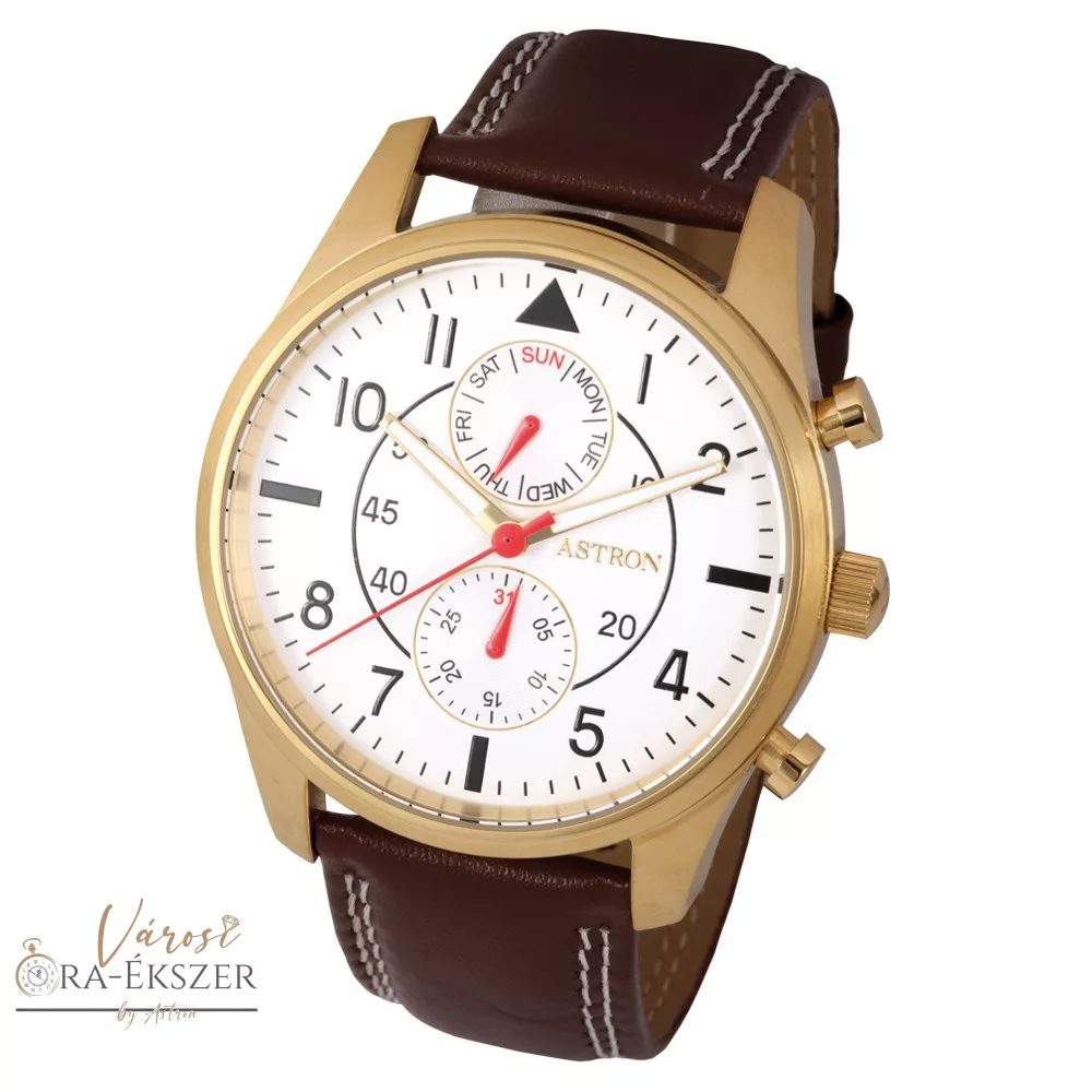 ASTRON 5534-8 férfi karóra, multifunkciós, arany színű nemesacél tok, barna bőrszíj, fehér számlap, keményített ásványüveg, quartz szerkezet, 50 m (5 ATM) vízállóság