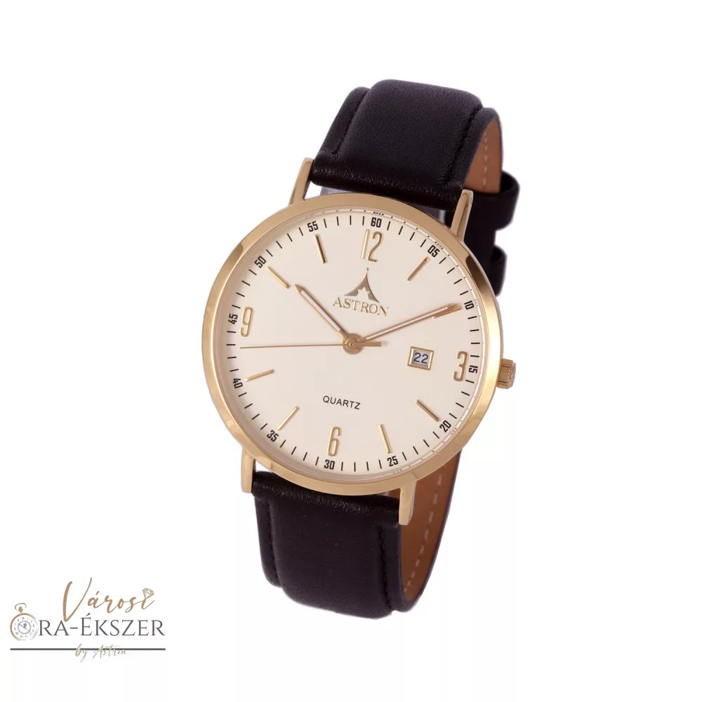 ASTRON 5536-9 férfi karóra, arany színű nemesacél tok, sötétbarna bőrszíj, pezsgőszínű számlap, keményített ásványüveg, quartz szerkezet, cseppmentes vízállóság
